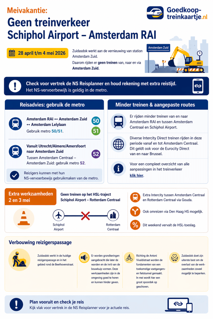 Reizigers die in de meivakantie via Amsterdam Zuid willen reizen, moeten rekening houden met forse aanpassingen. Van 28 april tot en met 4 mei rijden er namelijk geen treinen van, naar en via station Amsterdam Zuid. Ook het traject tussen Schiphol Airport en Amsterdam RAI wordt geraakt. De onderbreking is nodig vanwege grootschalige werkzaamheden van het project Zuidasdok.
